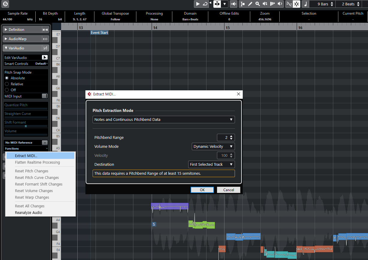 Extract MIDI 창을 열어서 Notes and Continuous Pitchbend Data 누르면