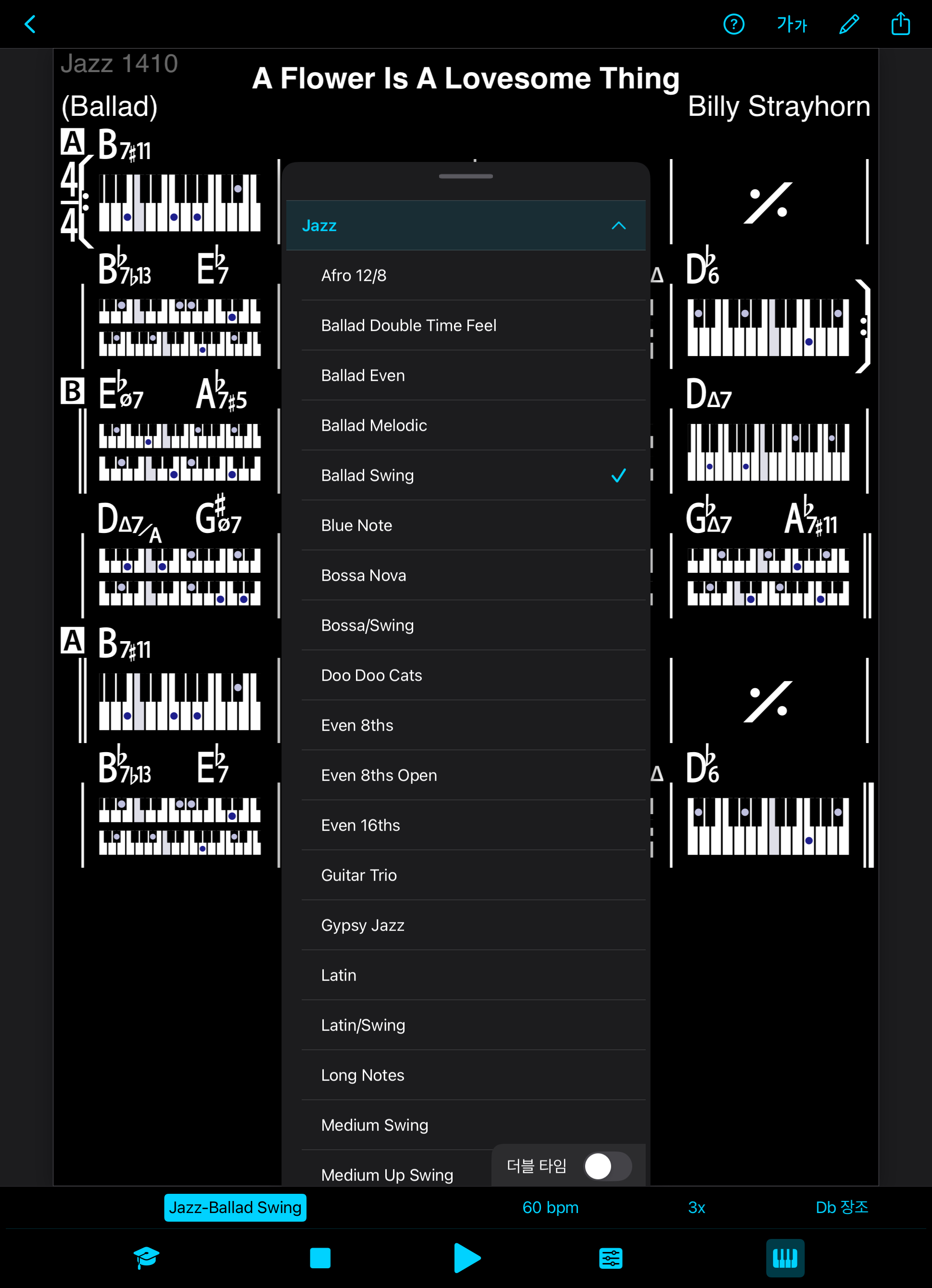 Jazz, Latin, POP, Blues 등 다양한 장르로 연습할 수 있고,